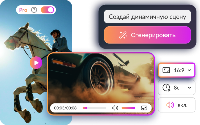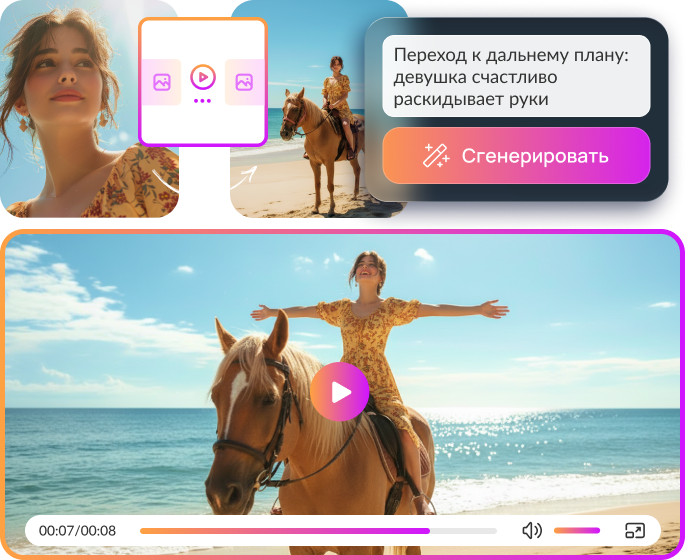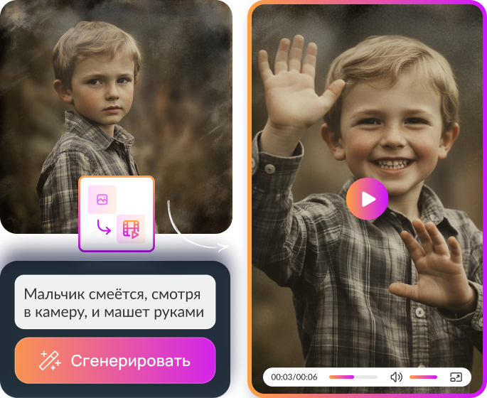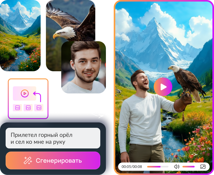 Превращайте текст и фото в динамичные ролики с помощью ИИ. Получите готовый результат для Reels, карточек товаров и публикаций в соцсети без аренды студии, актёров и сложного софта.