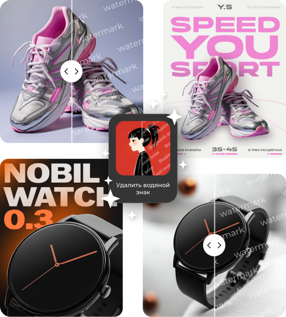 Платформа использует мощные алгоритмы, которые легко справляются со всеми типами водяных знаков: полупрозрачными логотипами, надписями, сложными текстурами и другими нежелательными элементами.