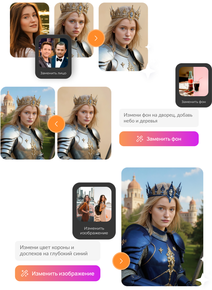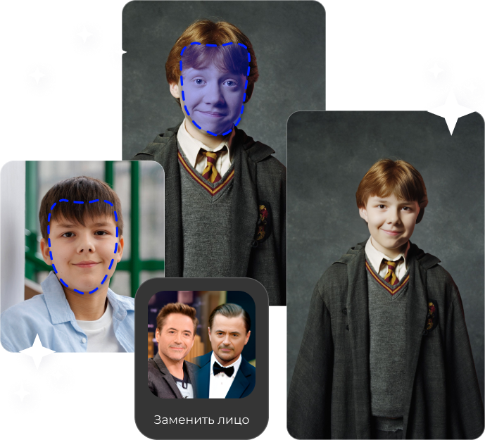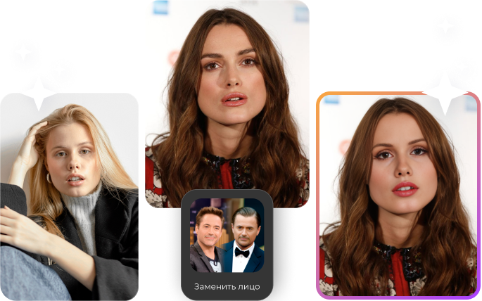 Возможности применения функционала ИИ-мастерской ограничены только вашей фантазией. Функция замены лиц онлайн бесплатно идеально работает в любых ситуациях.