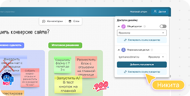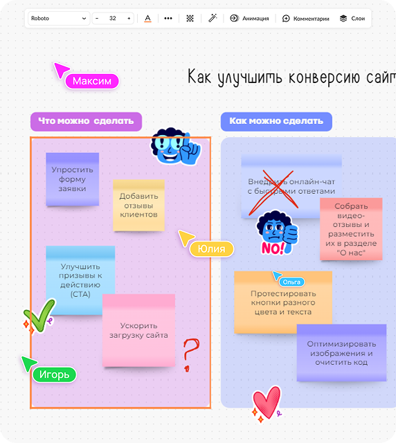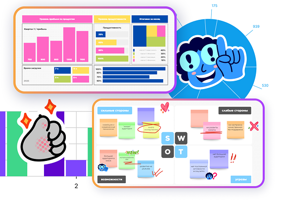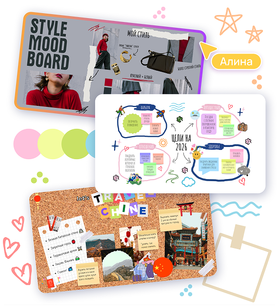 Используйте онлайн-доску не только для работы в команде, но и для себя. Планируйте личные проекты, фиксируйте мысли, создавайте мудборды и визуализируйте свои цели в одном месте.