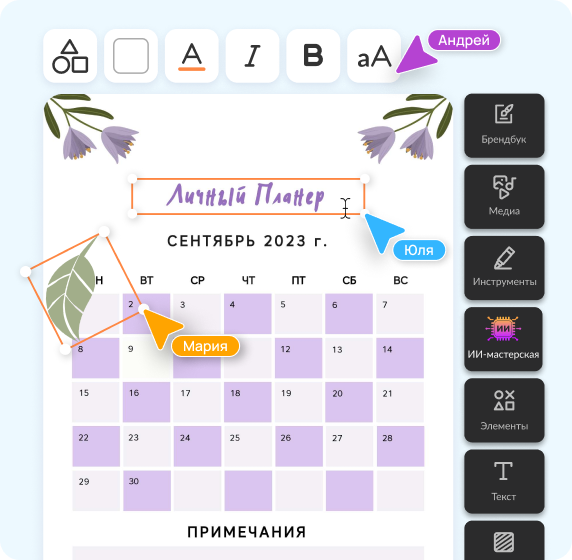 Рукописные списки с задачами все время теряются в ворохе других документов, в сутках не хватает часов на все, что вы запланировали, а в шторме дедлайна вы регулярно забываете о не менее важных делах. Знакомо? Хватит тонуть в рутине: выходите из режима выживания с Flyvi! Наш сервис станет вашим персональным помощником для повышения эффективности: создание стильного планёра на неделю или месяц, понятного гайда или мотивирующего чек-листа — теперь дело 5 минут!